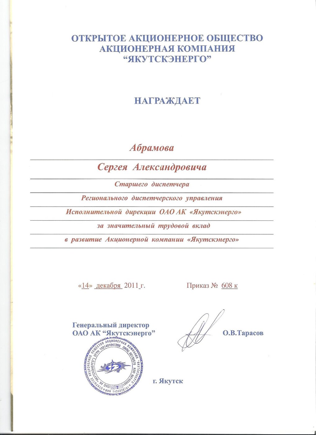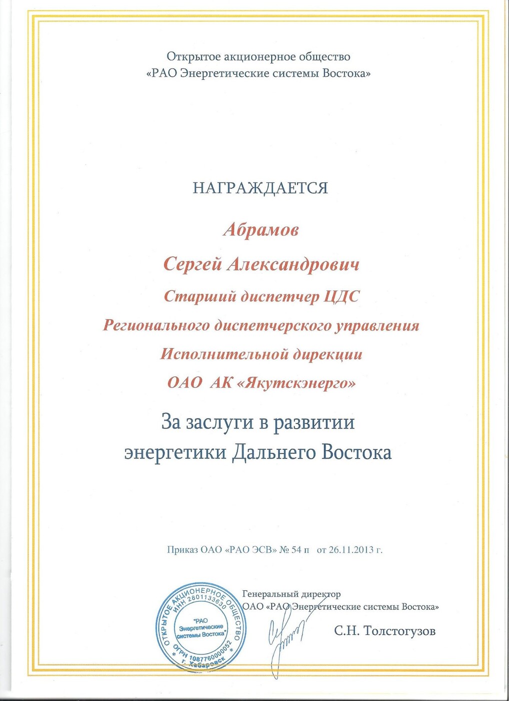 Неоднократно награжден благодарственными письмами, грамотами Компании и РАО «ЭС Востока», а также грамотами за спортивные достижения.