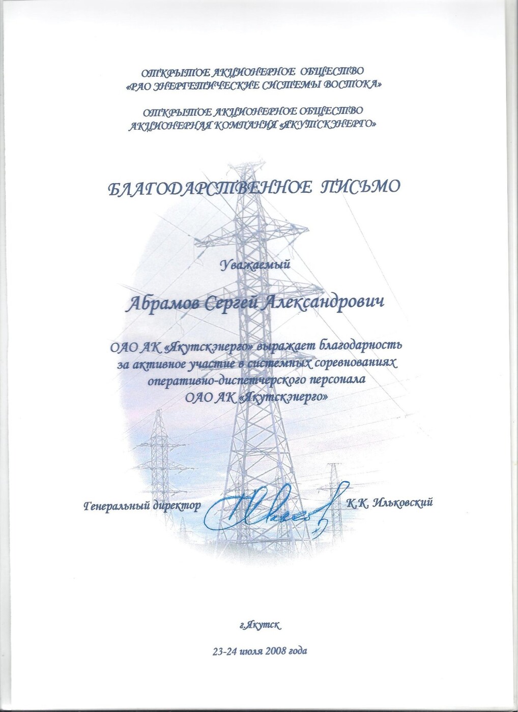 Во время работы диспетчером ЦДС, принимал участие в Первых соревнованиях оперативно-диспетчерского персонала Компании, проходивших в 2008 году, являюсь их победителем. В 2012 году в должности старшего диспетчера, являлся одним из организаторов Вторых соревнований оперативно-диспетчерского персонала Компании. В 2013 году принимал участие в обучении на курсах подготовки ЦТПП ОАО «СО ЕЭС» к соревнованиям профессионального мастерства диспетчеров филиалов операционной зоны ОДУ Востока. Участвовал в подготовке диспетчеров ЦДС к данным соревнованиям, выступавшим на них вне конкурса.