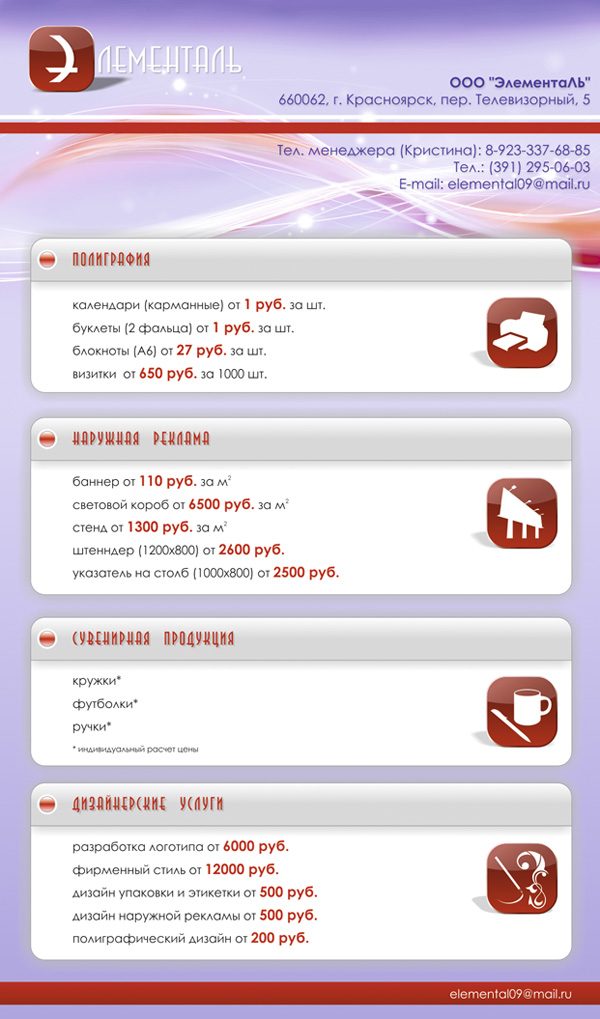 Создание и проектирование баннеров, визиток, плакатов, календарей и т. д., Разработка фирменного стиля и логотипа компании. Подготовка файлов к плоттерной резке и фрезеровке, верстка, Подготовка файлов к печати в типографию.
