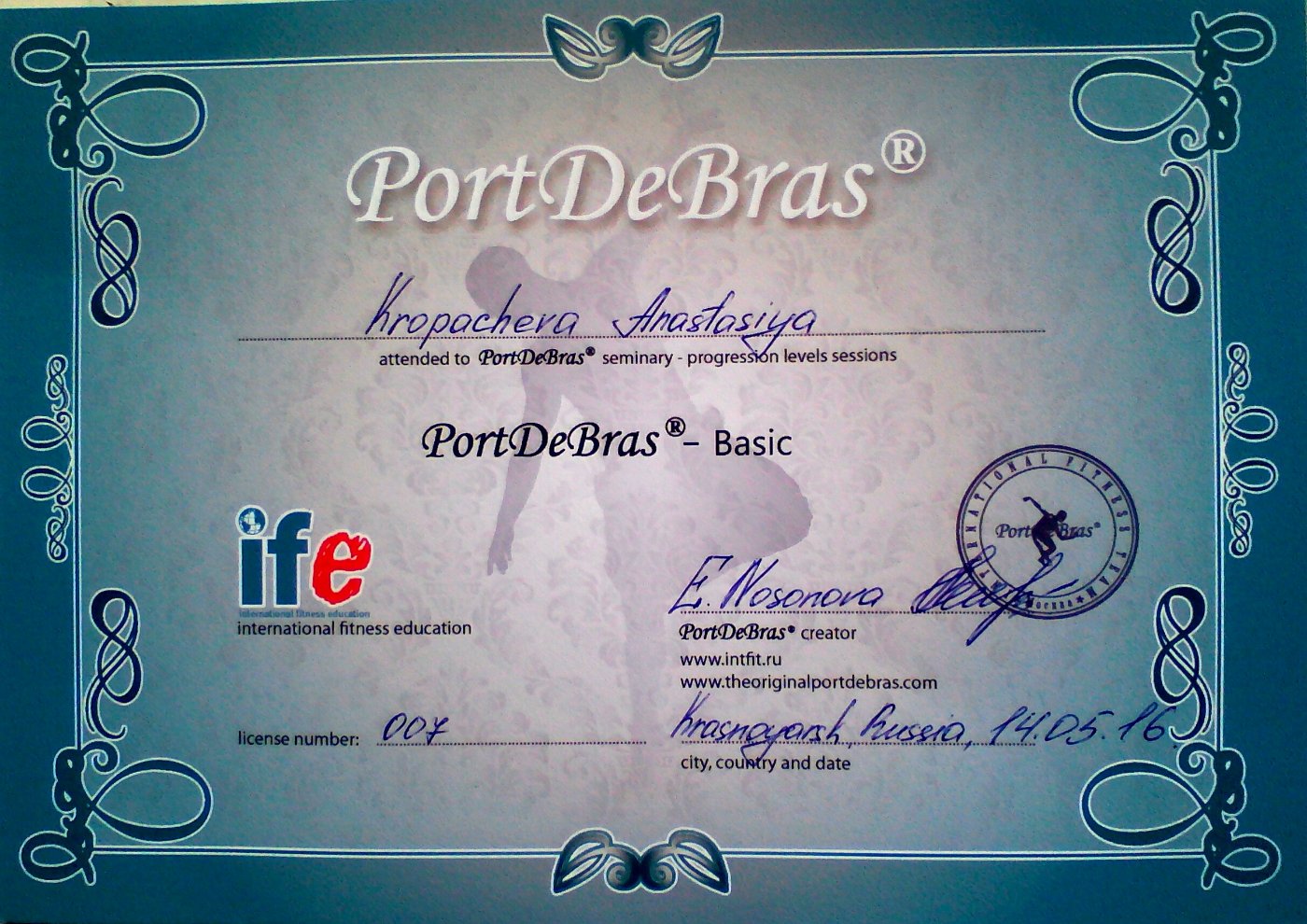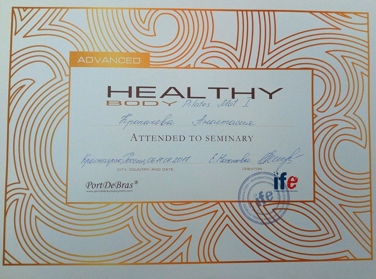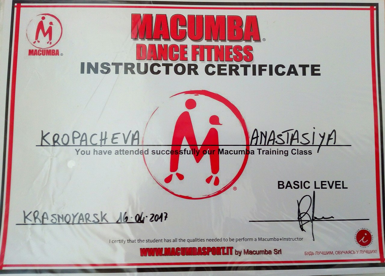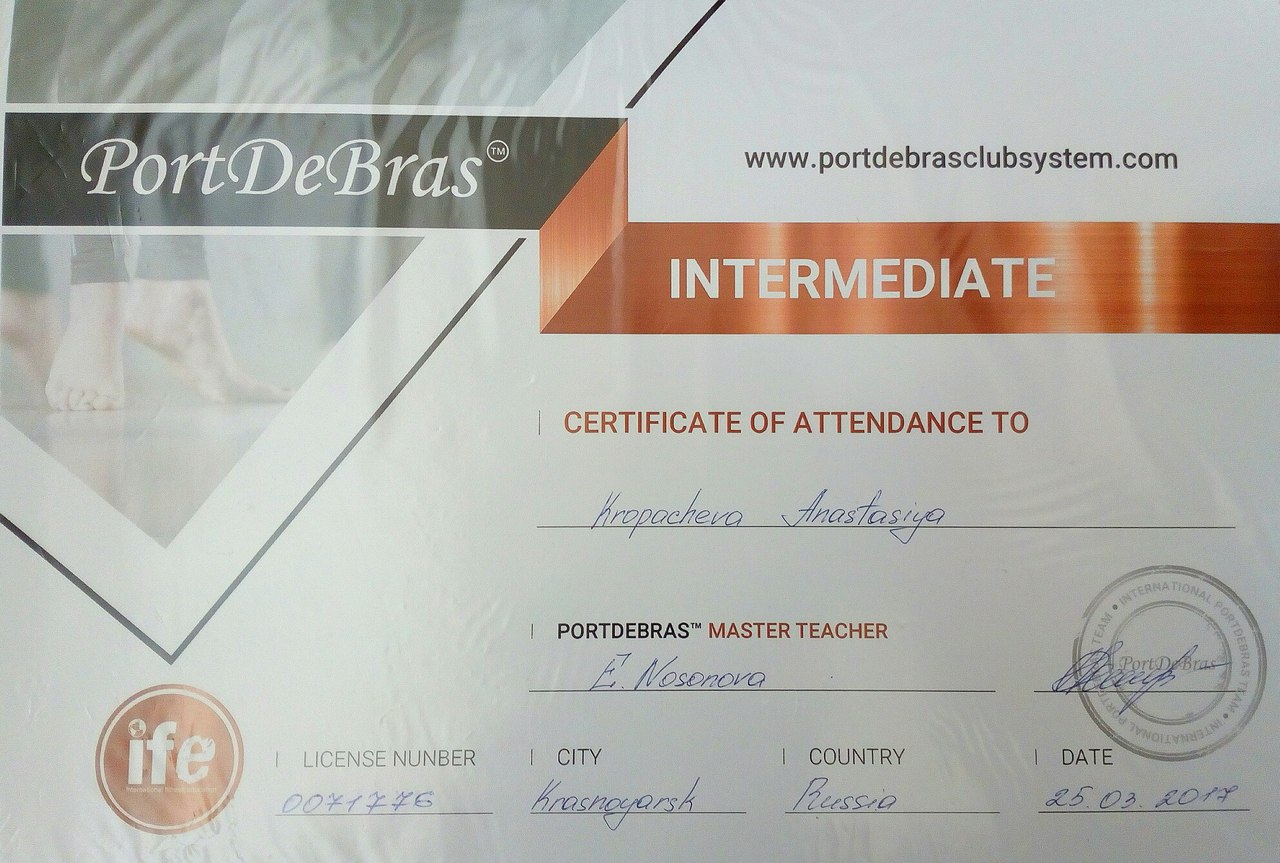 Имею сертификаты от ведущих иностранных балетмейстеров по технике контемпорари, джазу, хип-хопу, а также сертификаты и лицензии на проведение определенных программ фитнес-формата