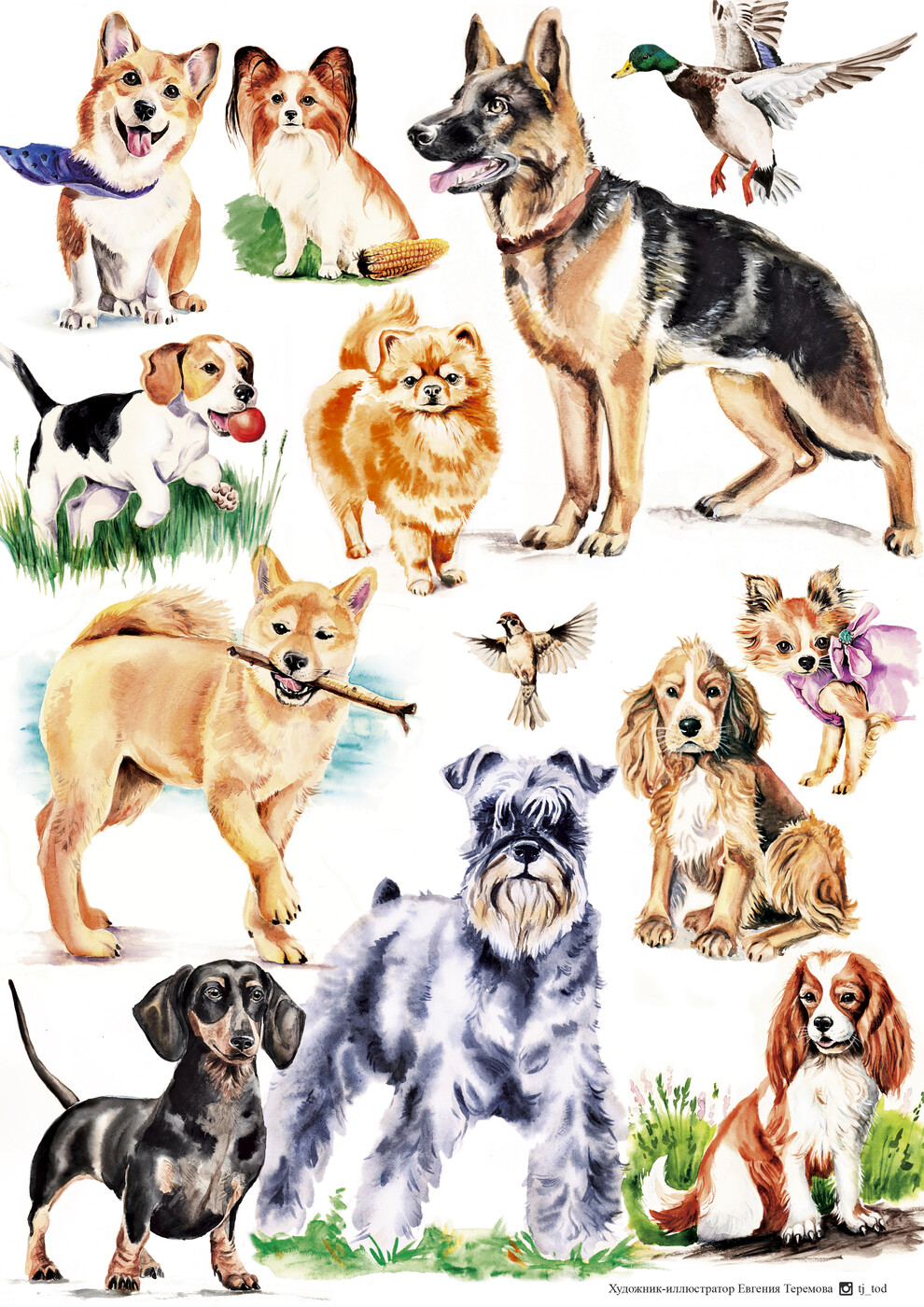 разработка макетов для полиграфии, проверка сторонних макетов на техническое соответствие, исправление ошибок, верстка каталогов и книг. Создание авторских акварельных иллюстраций для фирменных календарей