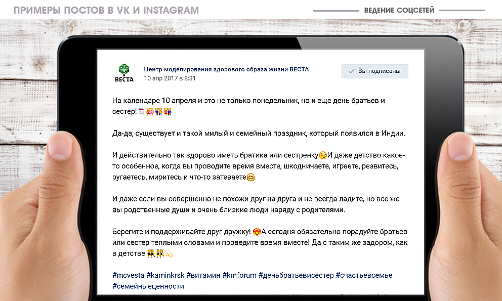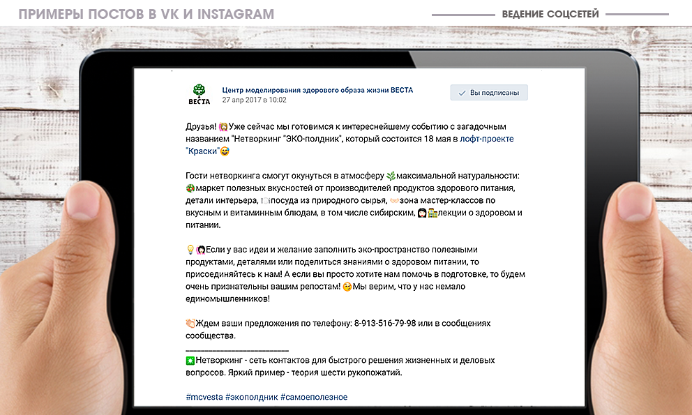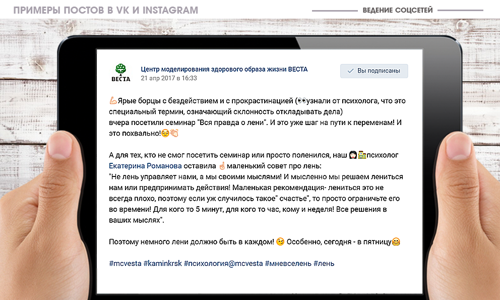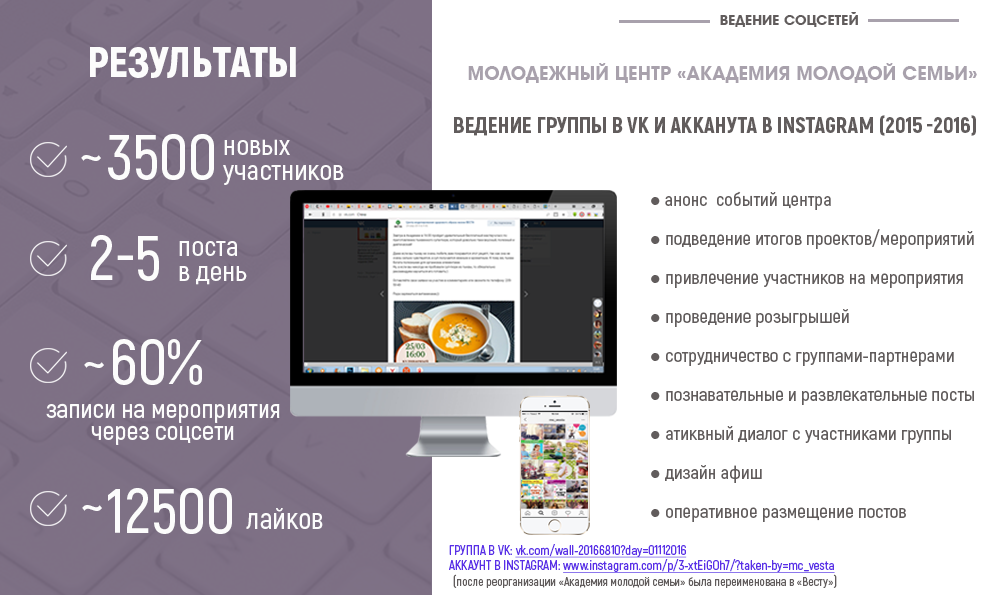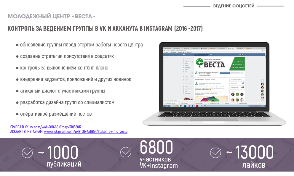 • разработка концепции и контроль за продвижение контента в соцсетях; «Вконтакте» и «Instagram»;