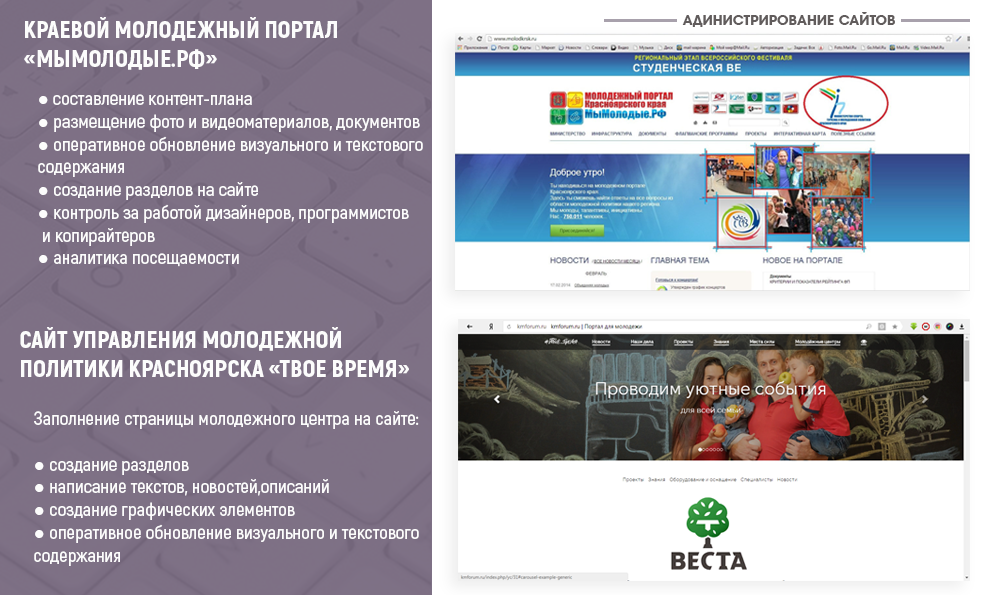• курирование и администрирование краевого молодежного портала «МыМолодые.рф», а так же создание контента для нескольких сайтов (одновременно): centrlider24.ru ; молодежныйфорум24.рф ; нашунивер24.рф ;