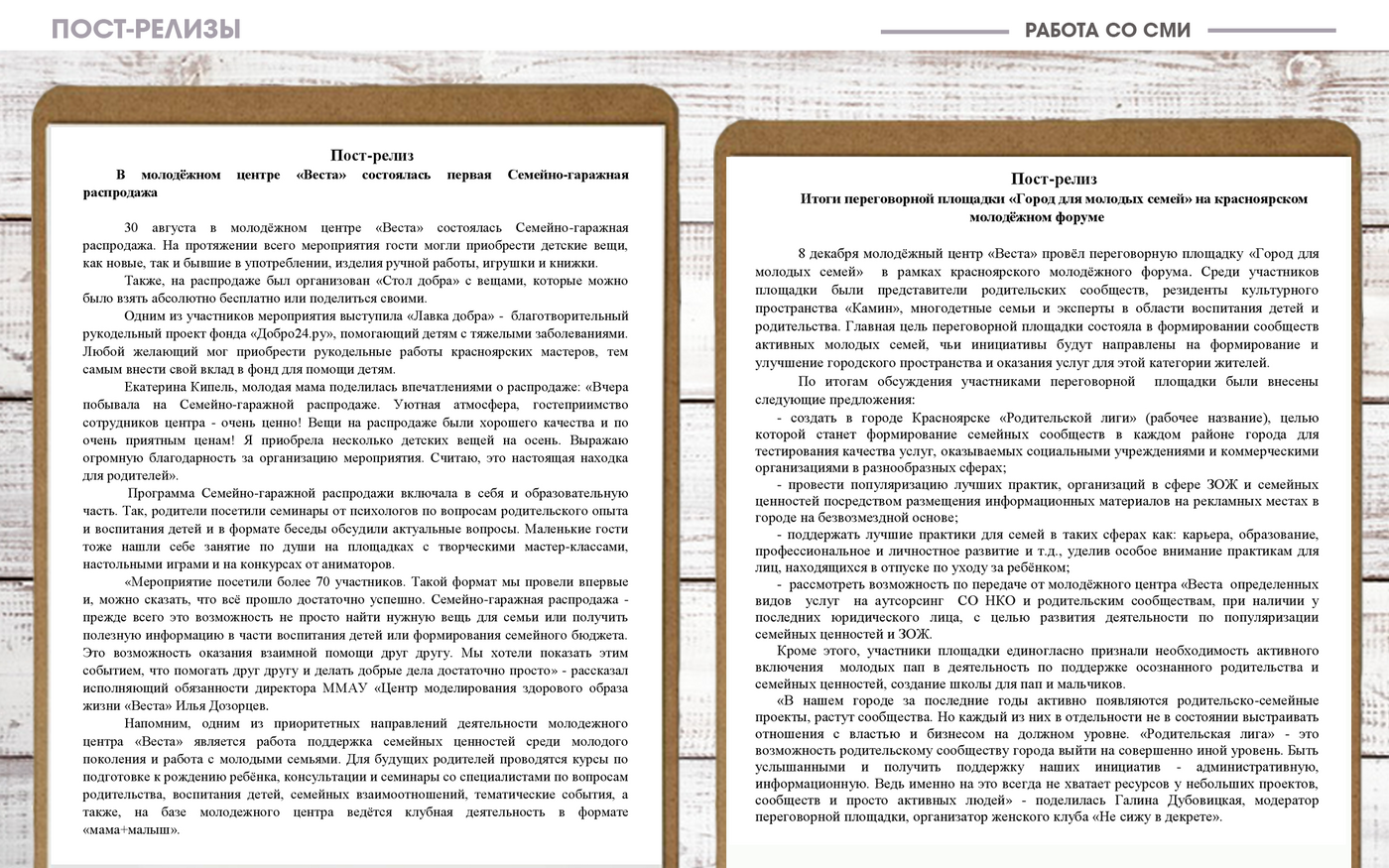 • подготовка пресс-релизов, новостей о деятельности центра/мероприятиях;