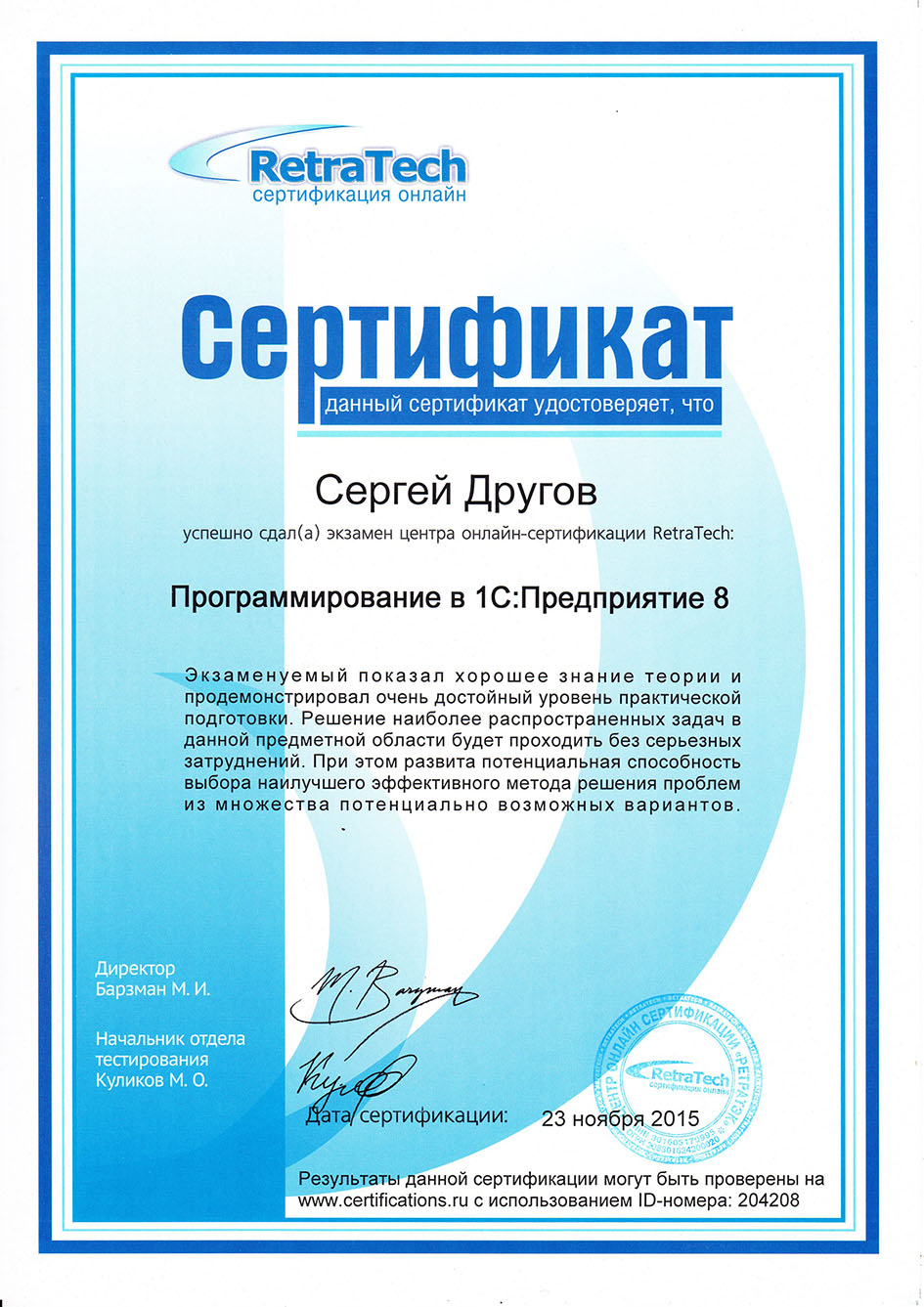 Сертификат Retratech «Программирование в 1С:Предприятие 8».