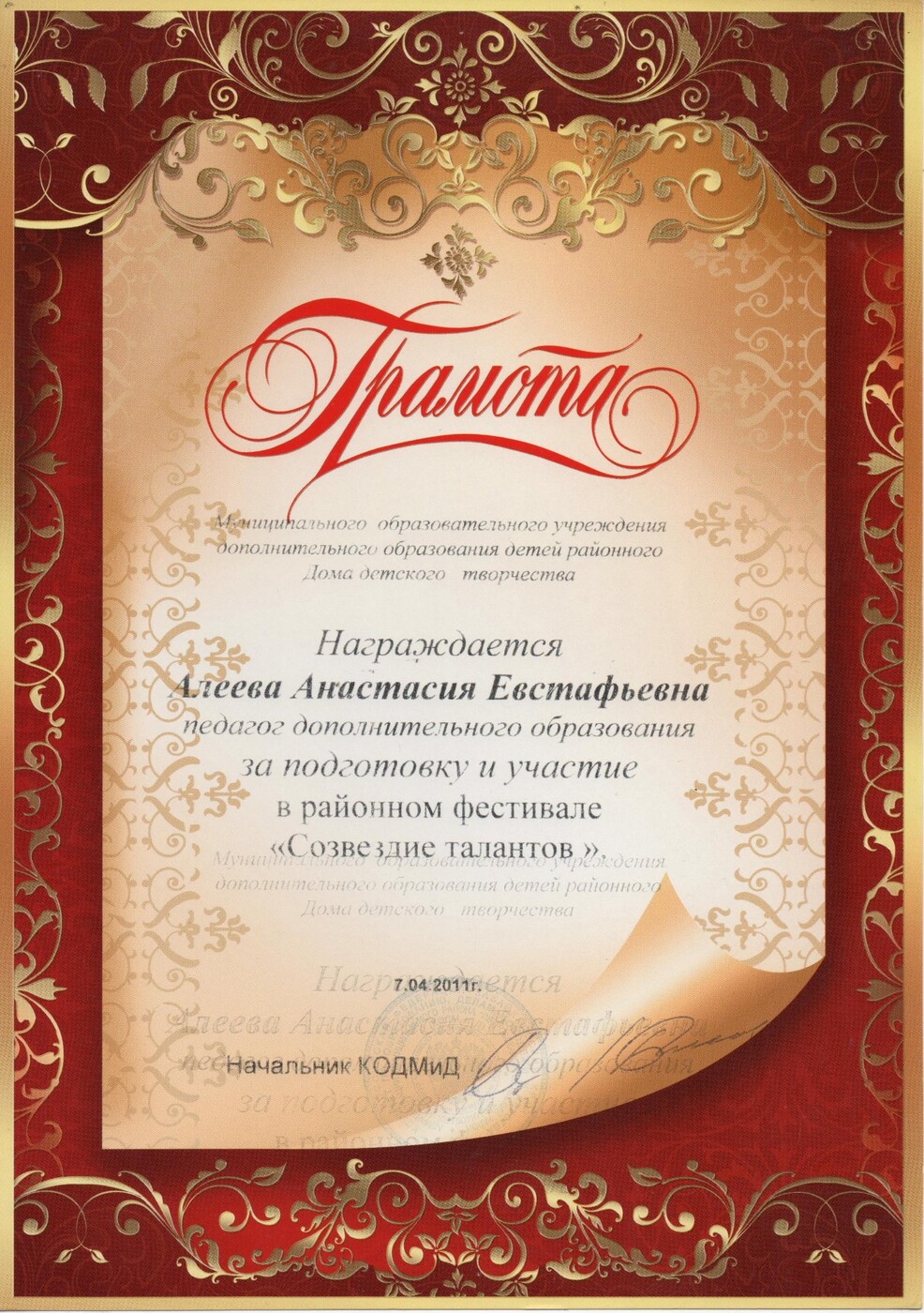 - получила дипломы за победу в районных фестивалях, конкурсах, где принимала личное участие